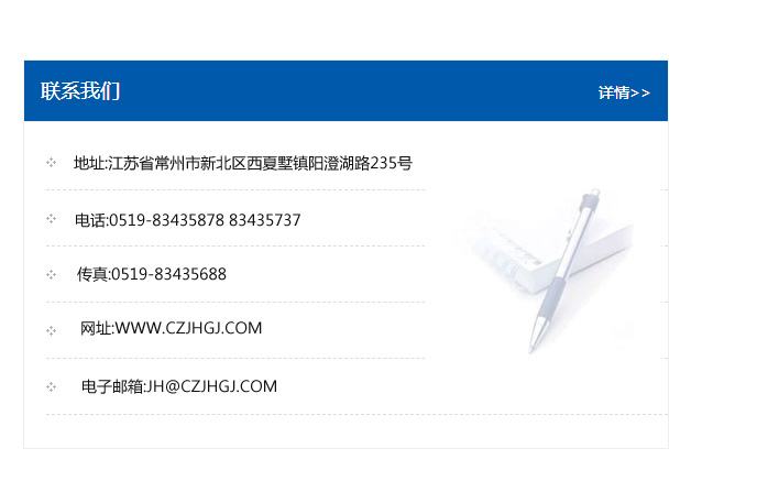 地址:常州市新北區友邦商務大廈1幢16、17層  電話:0519-85101652  傳真:0519-85112595  郵編:213022  網址:www.cz-jiayue_cn.zjwtp.com  郵箱:xiajifengaa@163.com